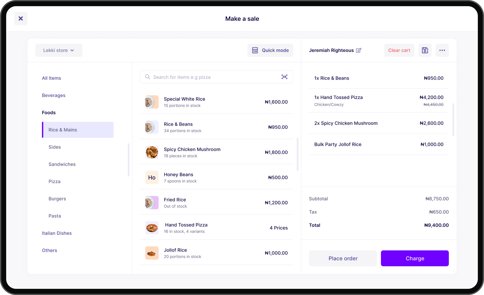 Our goal was to make this selling experience simple and intuitive. At the top left, merchants can also switch between sales channels they want to sell from (if they have multiple sales channels). You can sell via the quick mode (without having an item/product to sell). This is convenient for service-based businesses. Merchants can do many other things, like adding customers to orders, clearing carts, saving orders, and many more cart options when you click the more icon.